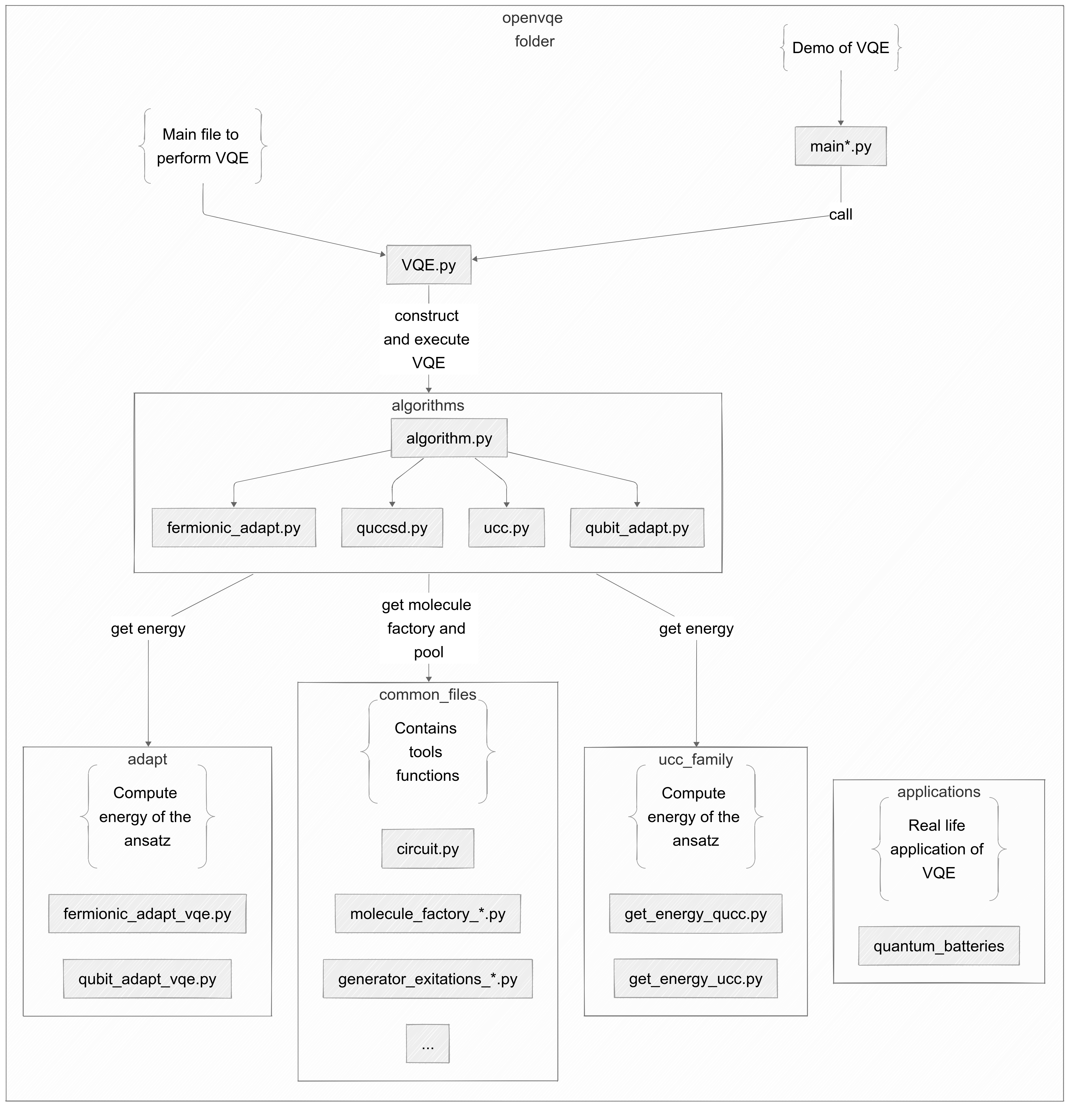 - OpenVQE code diagram showing the main structure of the code and their involvement when executing VQE.